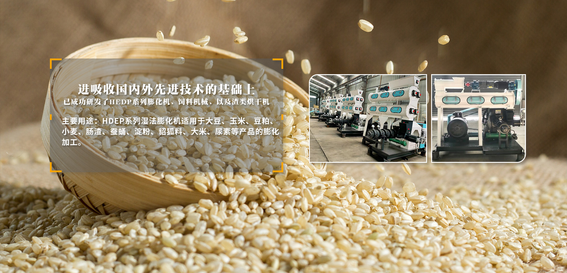 充分引進(jìn)吸收國(guó)內(nèi)外先進(jìn)技術(shù)的基礎(chǔ)上,已成功研發(fā)了HEDP系列膨化機(jī)、飼料機(jī)械、以及渣類(lèi)烘干機(jī)